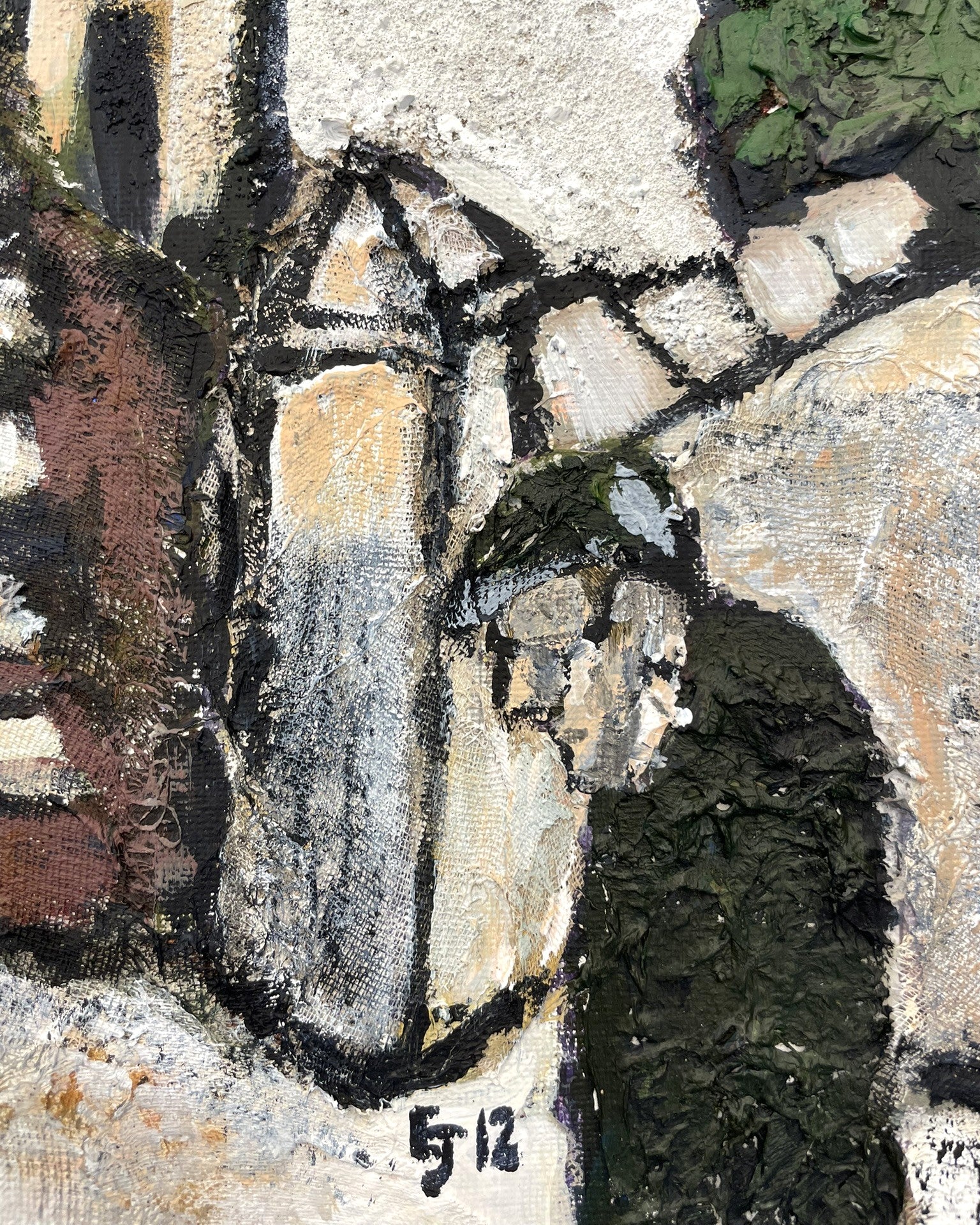 A very striking contemporary mixed media piece. Strong nods to Northern English artists like Theodore Major and Lowry but also reminiscent of Chagal and Josef Herman. Thick impasto acrylic is combined with rags and what appears to be chipped stone and wood, but the effect is a scene that has depth and poignancy.