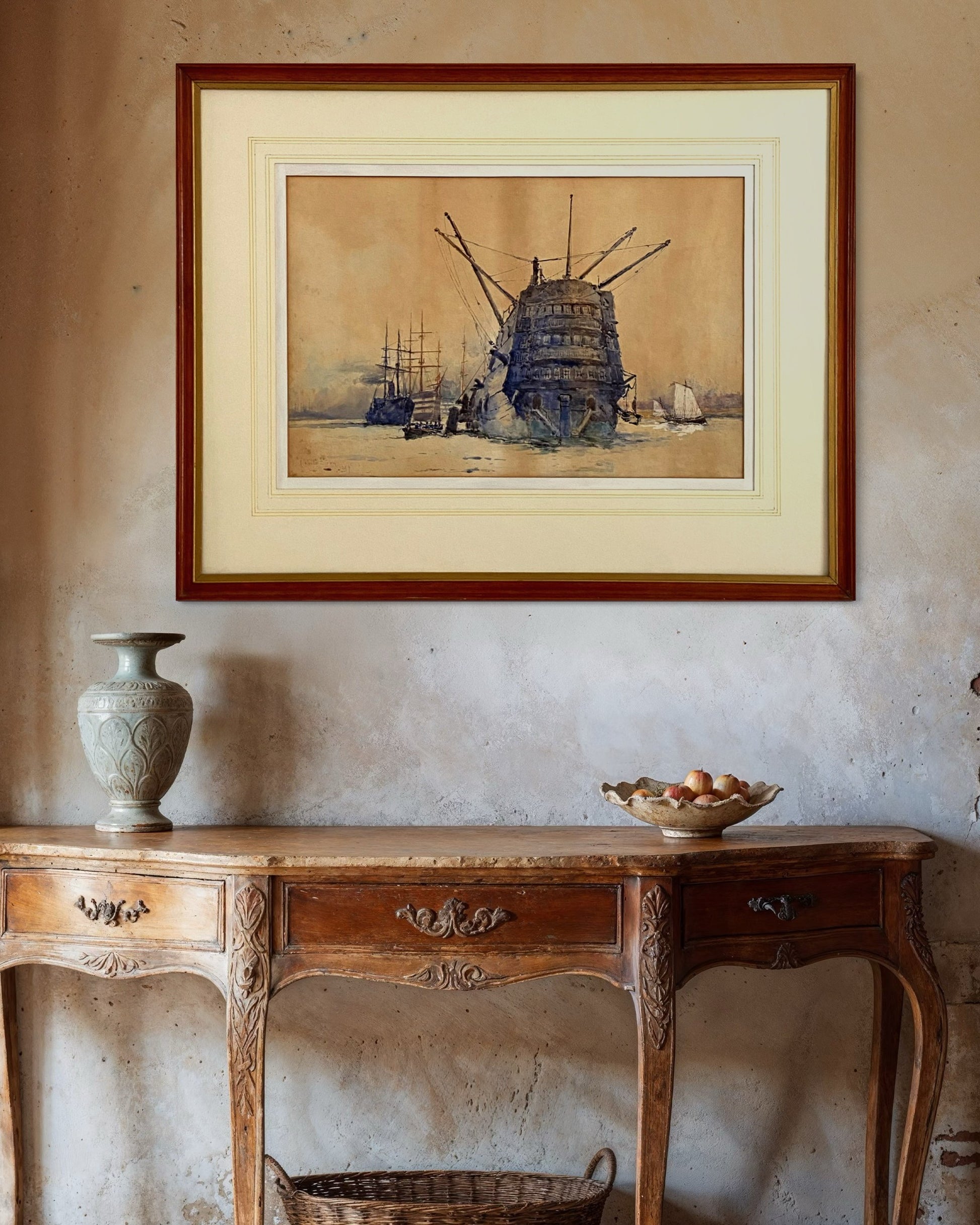 The watercolour has a less finished quality than many of Dixon’s more iconic watercolours and presumably this was a sketch painted at location in Portsmouth. There is a later drawing (c1900) by Wyllie in the Royal Museums Greenwich depicting the ‘Pitt’ from the same perspective, the information for this post was taken from the RMG collections website.
