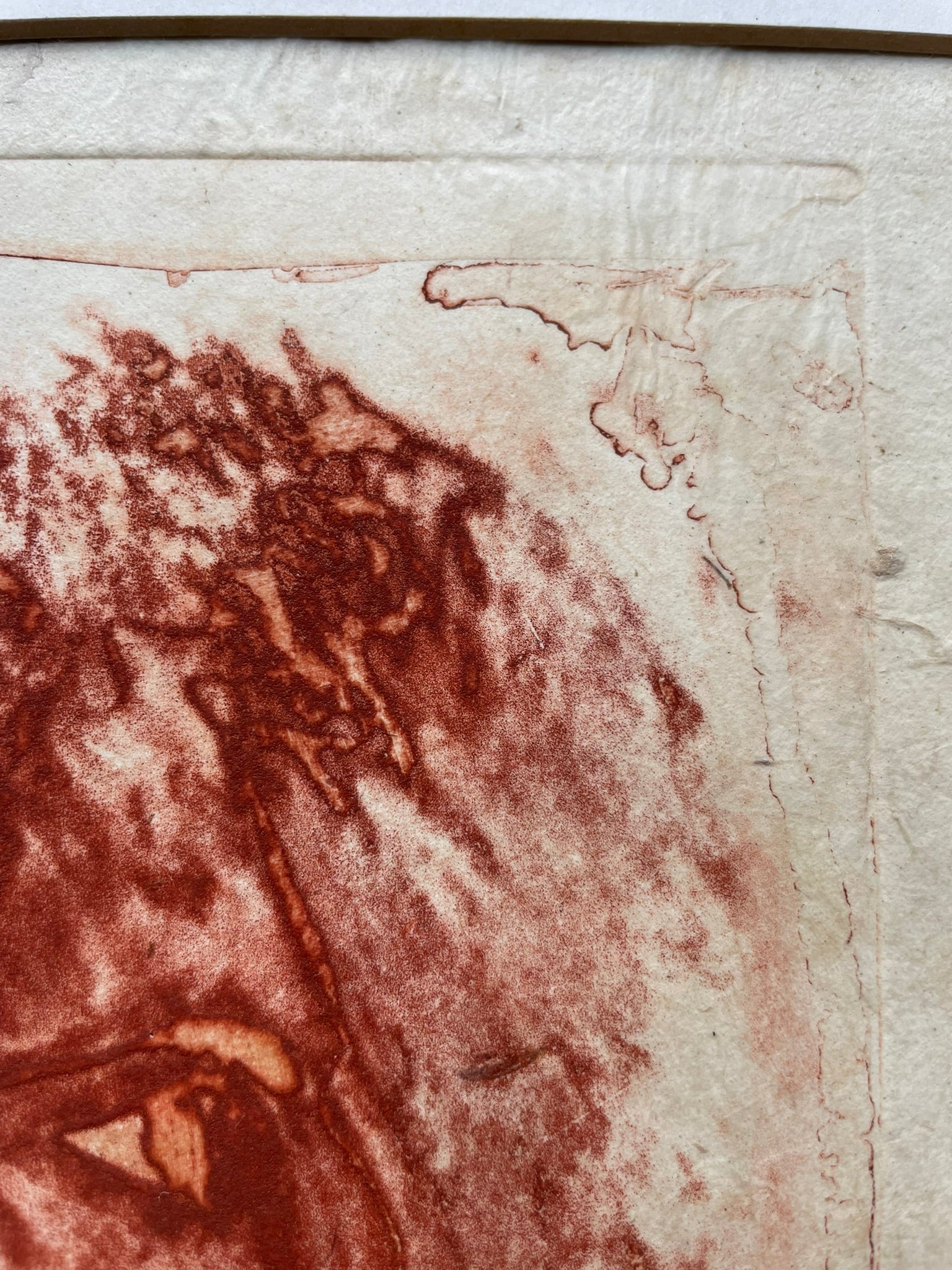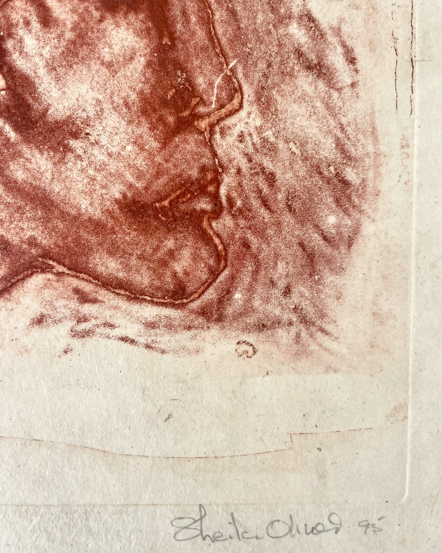 Etching in red ink of a woman’s profile by Sheila Oliner, 1995 artist proof, signed and framed