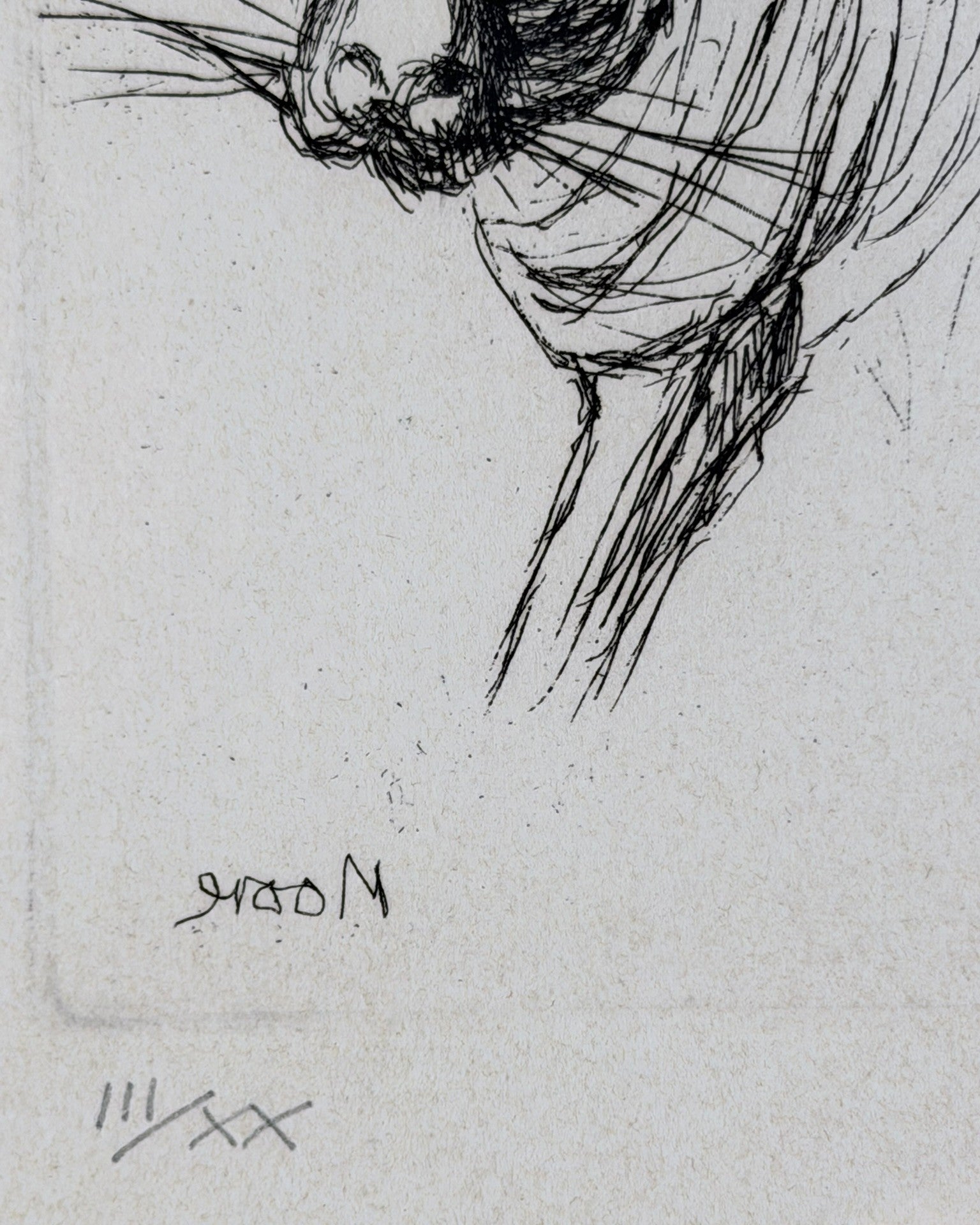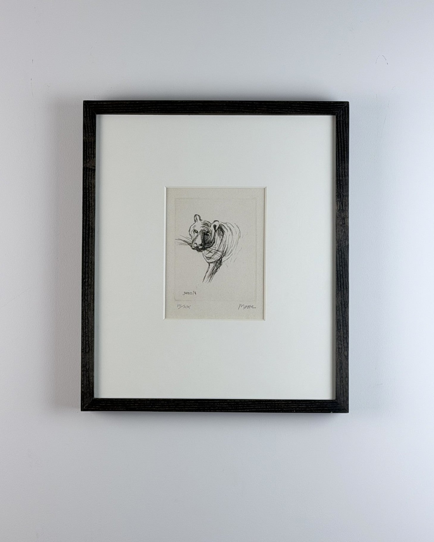 Although internationally renowned for his monumental reclining figures and public sculptures, Moore maintained a lifelong engagement with drawing and printmaking. In Tiger, his sculptural sensibility is evident: the form is built through contour and weight rather than surface detail, giving the animal a palpable three-dimensional presence within the flat plane of the paper.