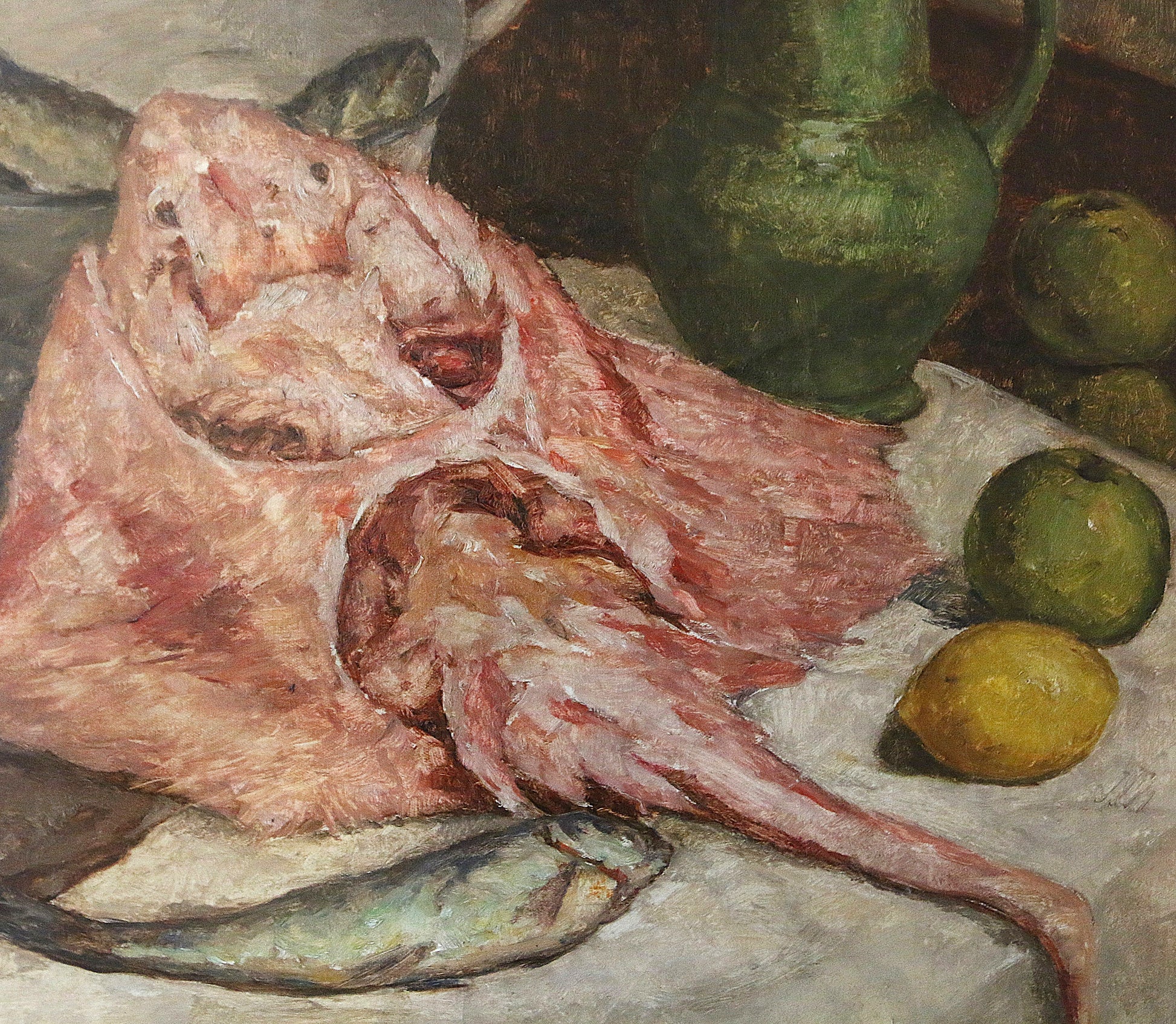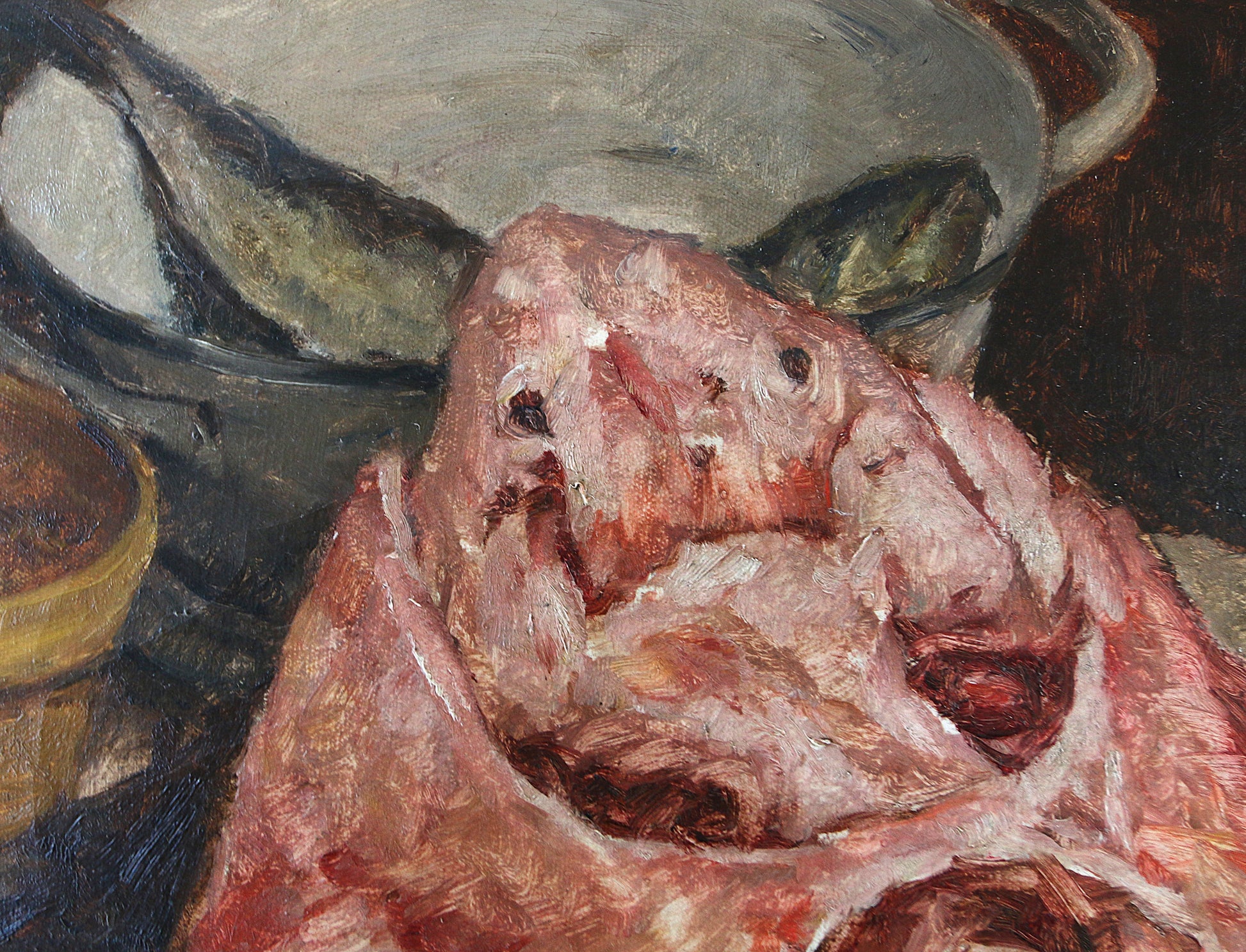 This large still life with a flayed ray at its centre recalls Chardin and Chaïm Soutine, yet in this case the filleted ray fish is laid on a table surrounded by mackerel and lemons. Isa Janssens work has appeared at auction in Europe and USA.