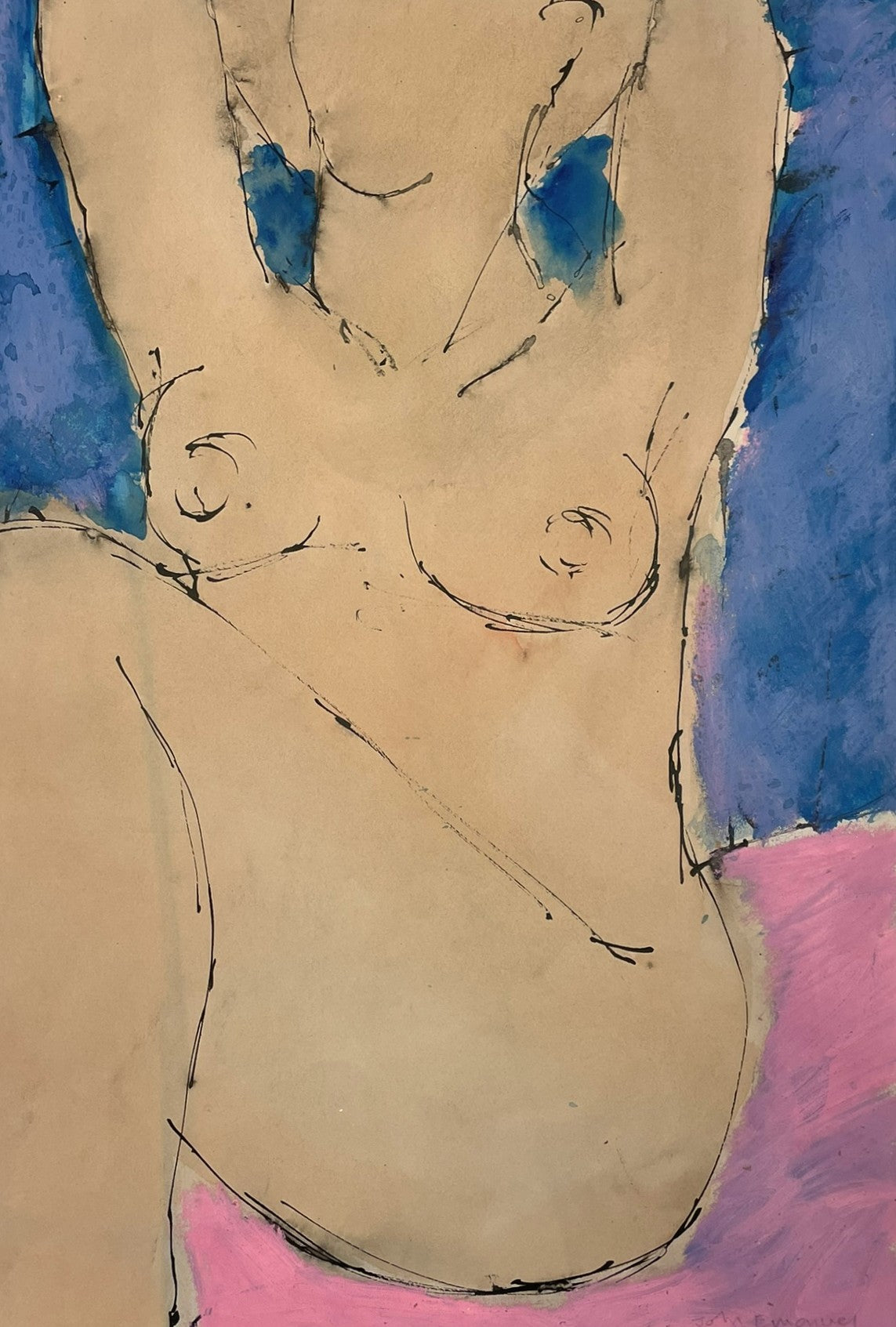 Emanuel’s mixed-media drawings, paintings, and prints focus on simplified, sculptural nudes integrated with the rhythms of the natural world. Exhibited widely across the UK, he became a respected figure in the Cornish art community and a member of the Penwith Society of Artists. His work is celebrated for its quiet intimacy, clarity of line, and deep sense of place.