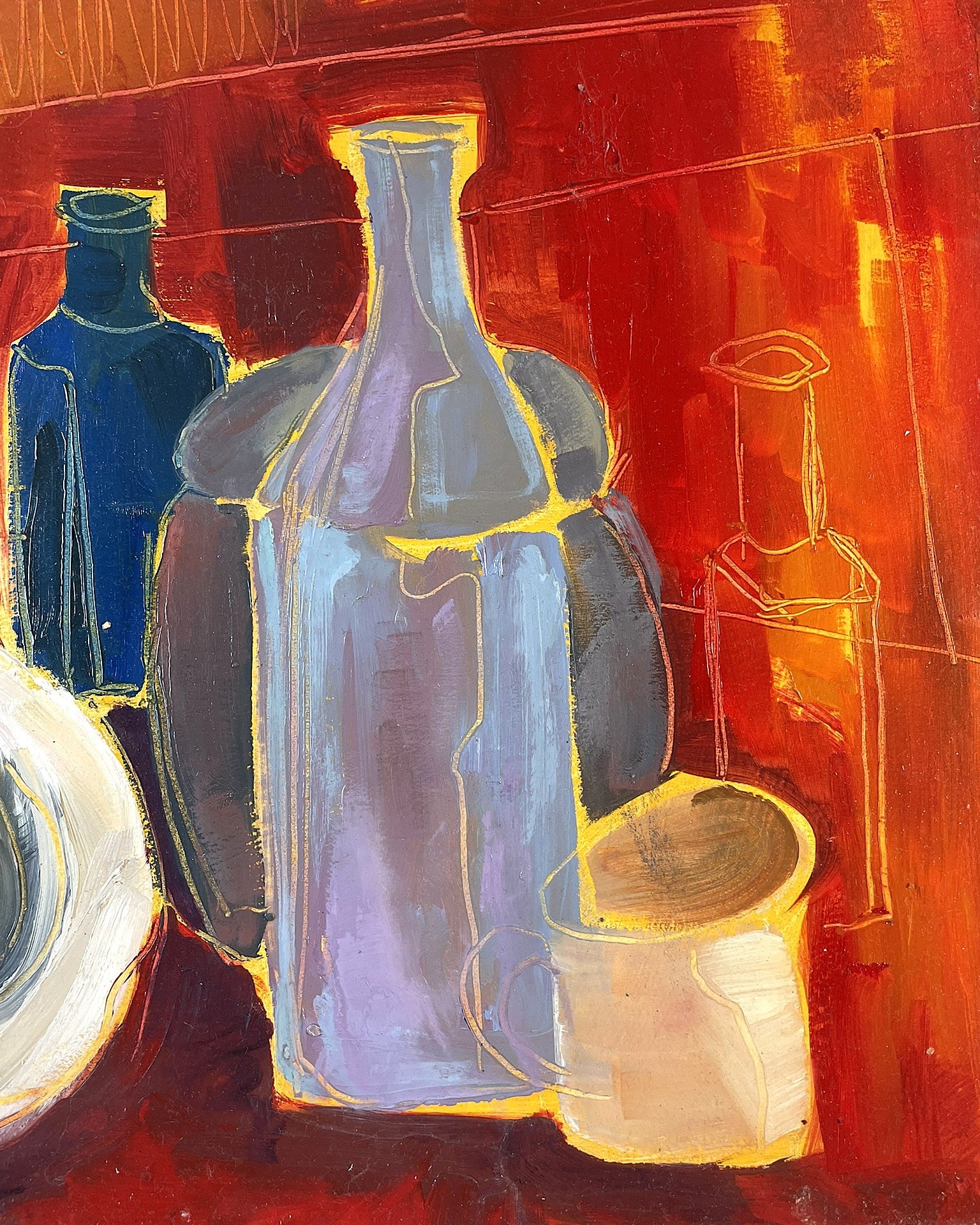 Minimal in composition but full of dynamism, the bold juxtaposition of tone and the solidness of the form add a stillness that grounds the bold and vibrant colour palette in this abstract still life. Somerset based artist Michaela Justice is known for her abstracted landscapes but this still life dates to her earlier body of work.